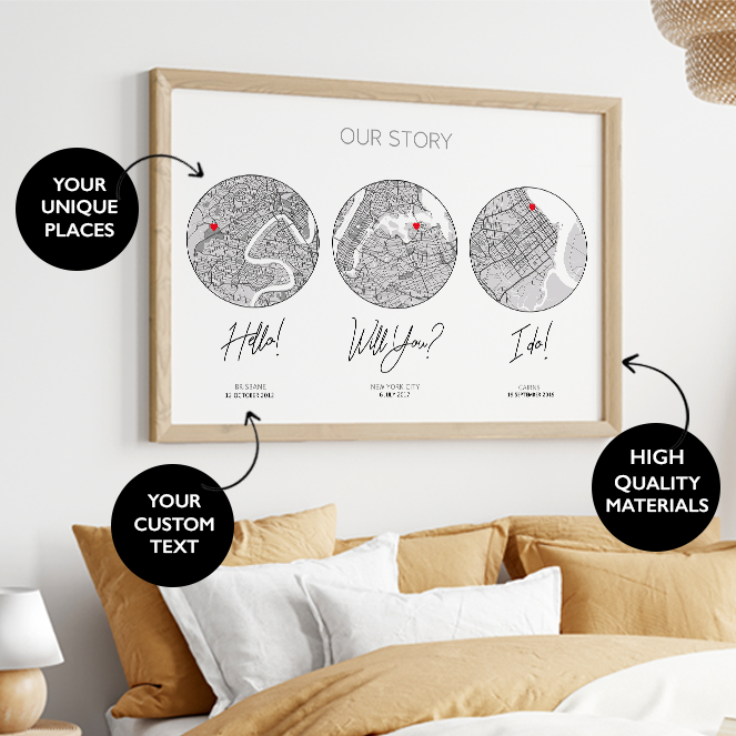 A custom our story map print is the perfect wedding gift for couples, anniversary gift for husband or wife or paper anniversary gift. It’s also a great wedding morning gift for your partner to surprise your future husband or wife with. Customise the text to suit your favourite three occasions.
