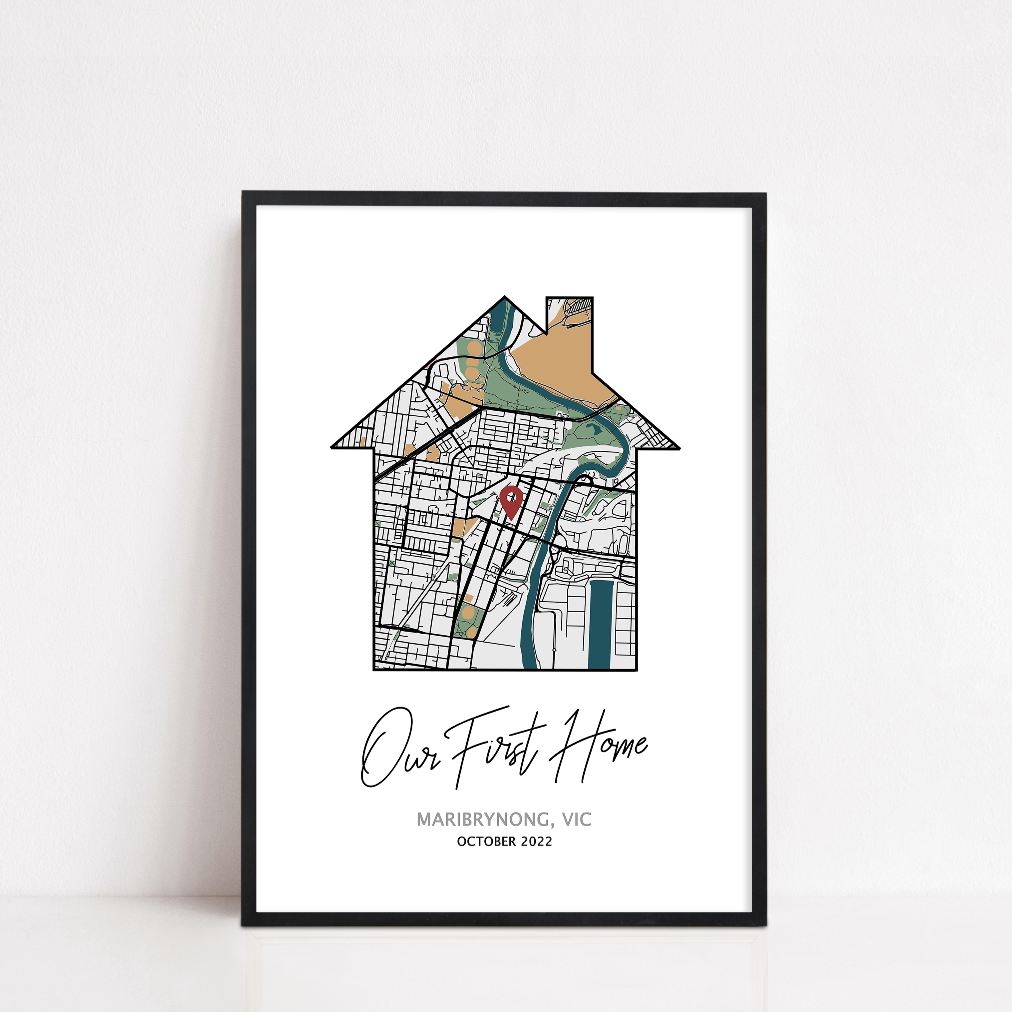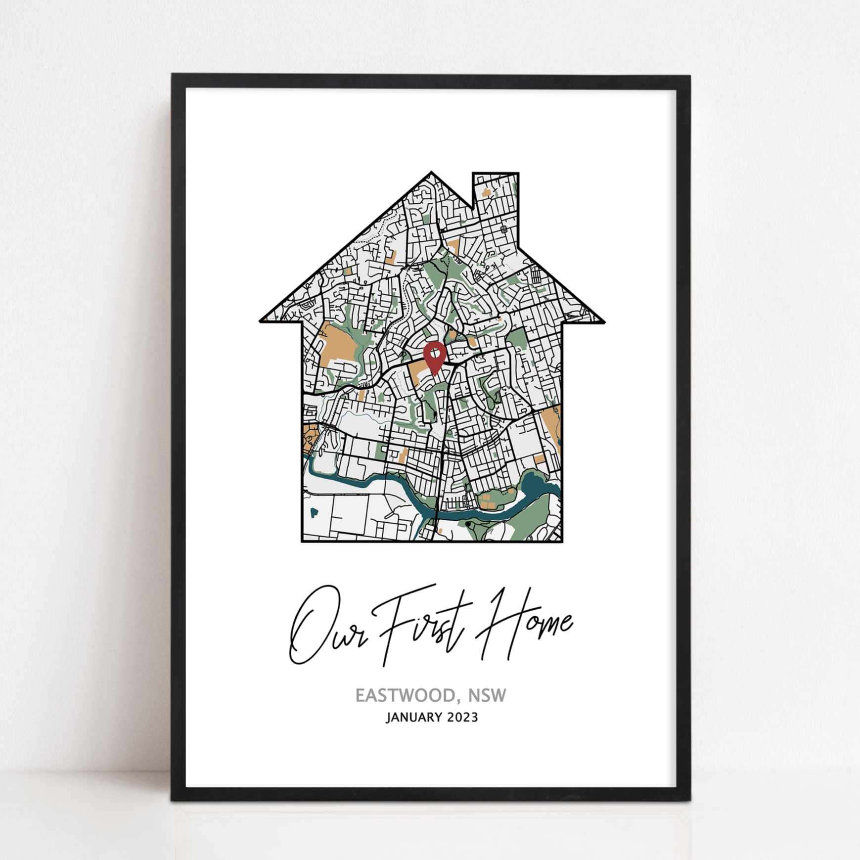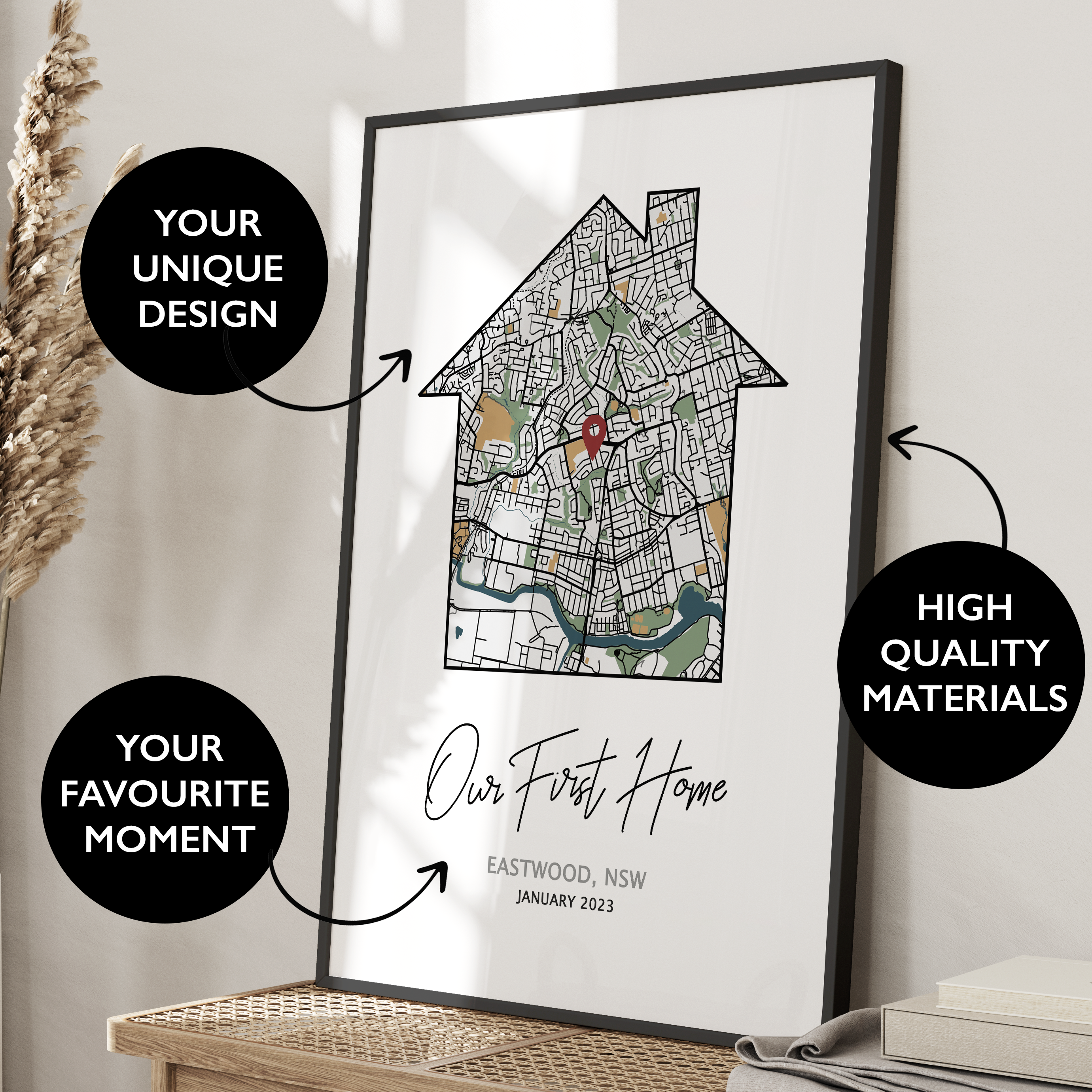 A custom map print is a unique new home gift for couples, friends or family. After looking for a house for so long, our custom maps capture this moment and location to remember forever as wall art. They also make great settlement gifts for relators and estate agents looking for a gift that customers will talk about for years to come.