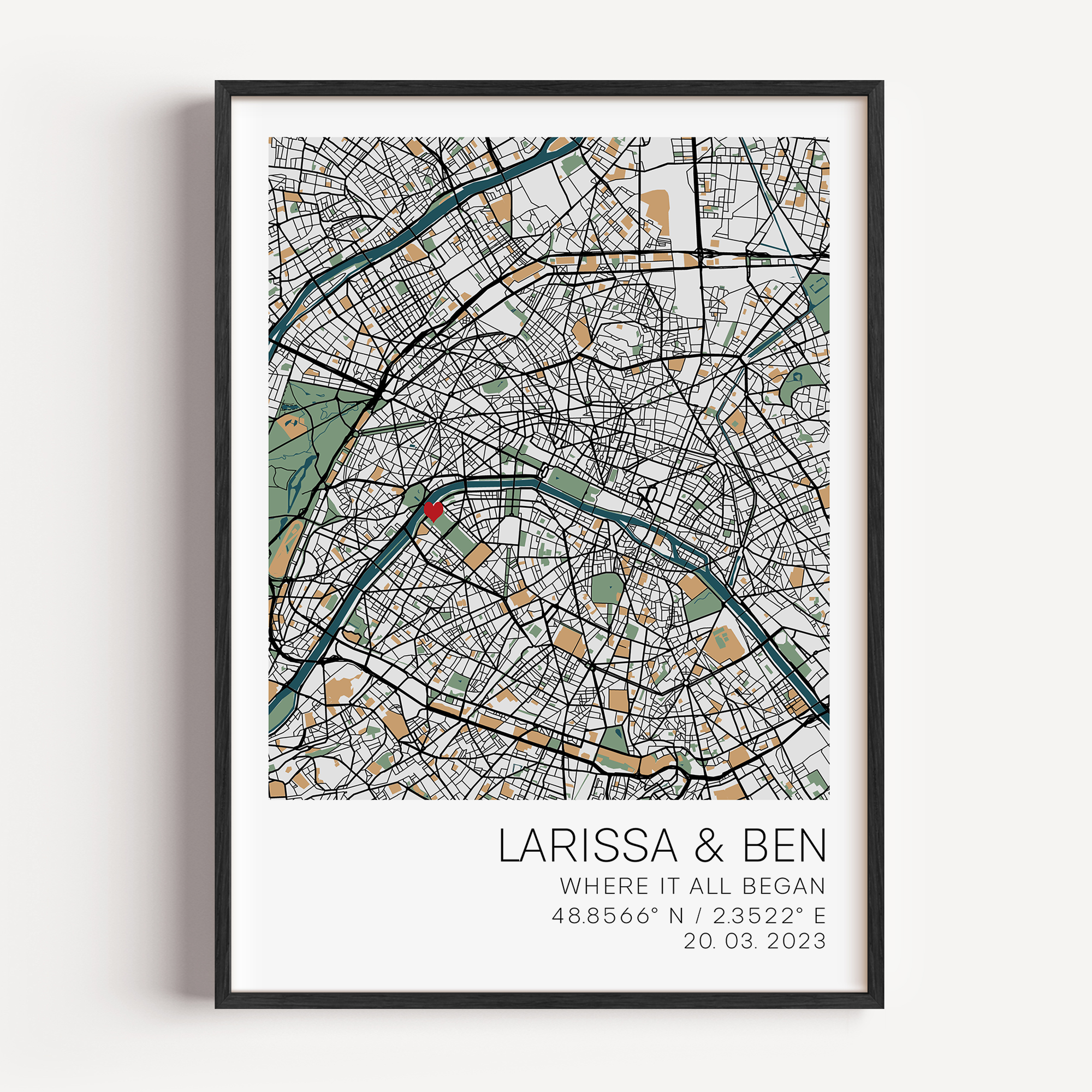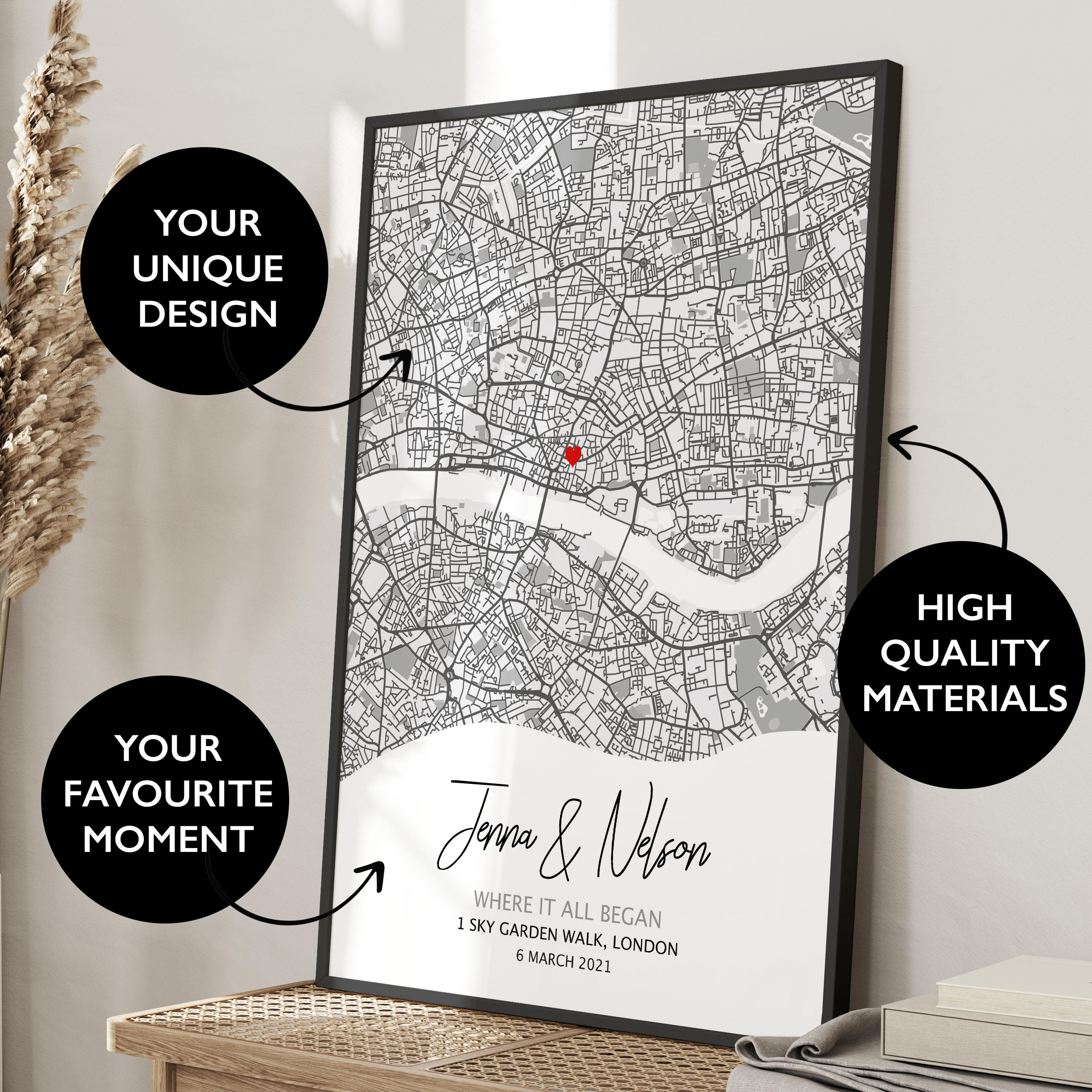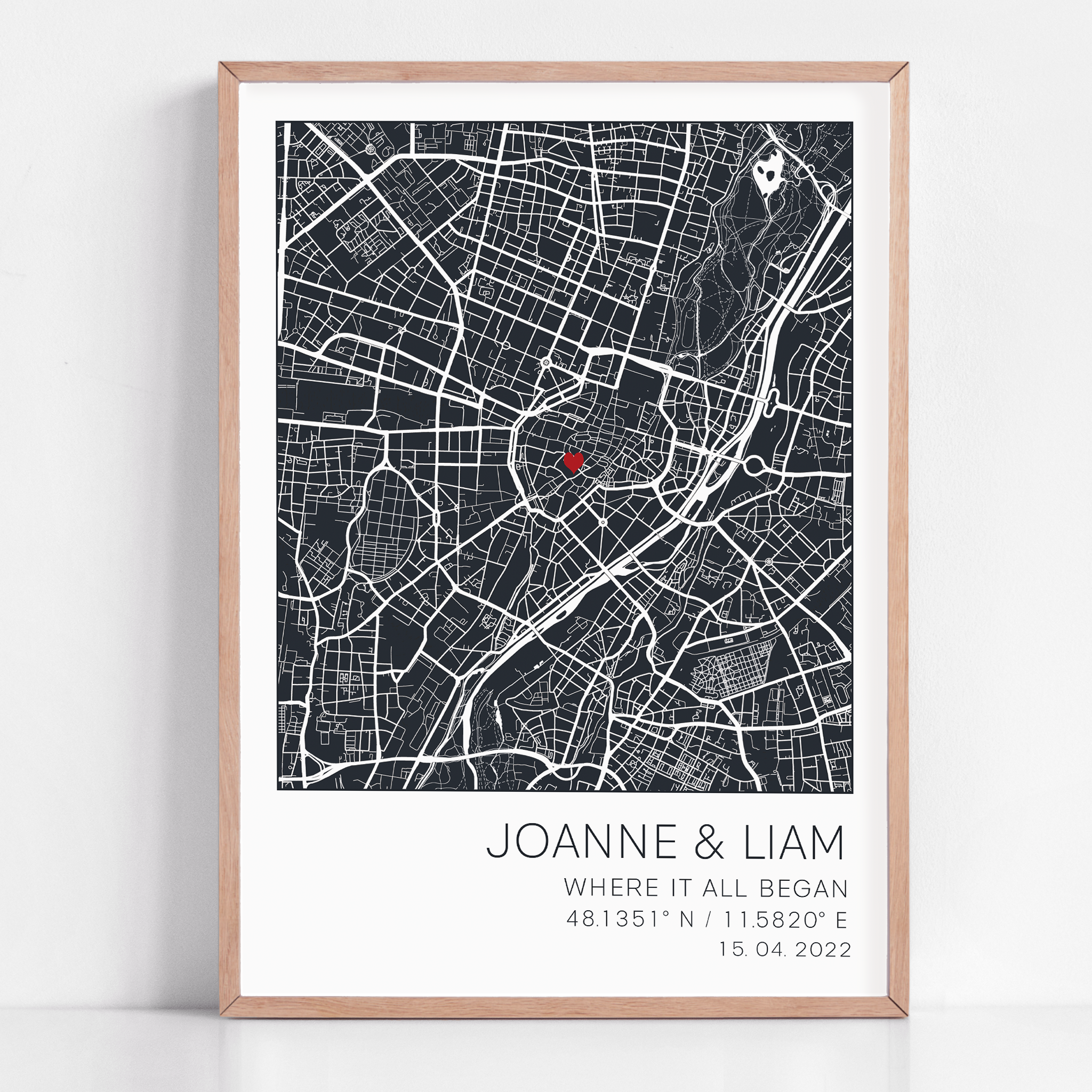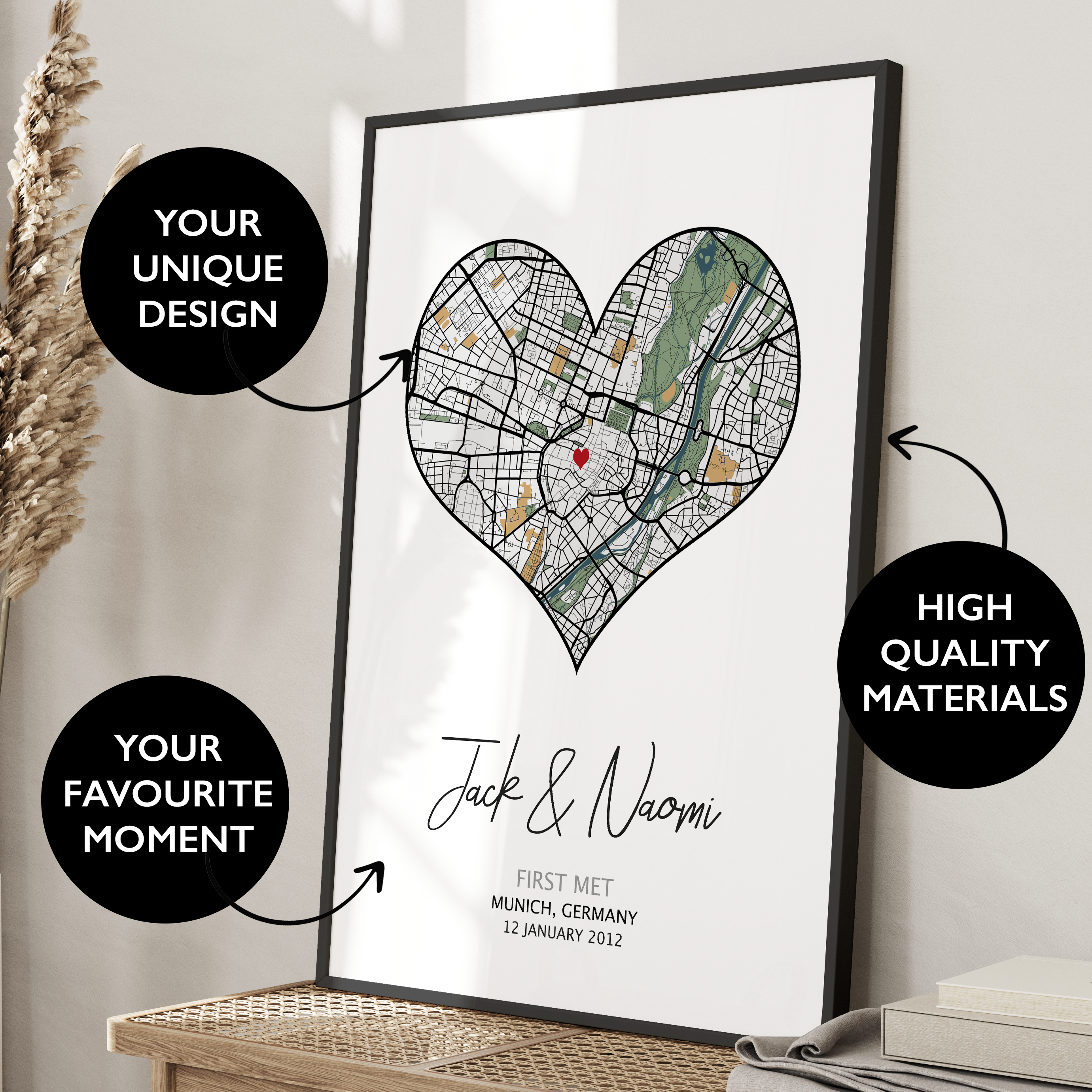 Ricorda i momenti più significativi della vita con mappe personalizzate, perfette come regalo per il primo appuntamento. Celebra il momento in cui tutto ha avuto inizio con una stampa personalizzata che cattura la tua storia unica.