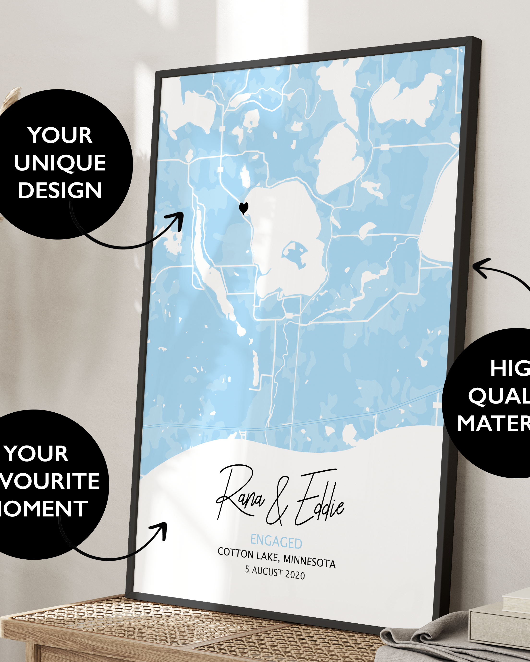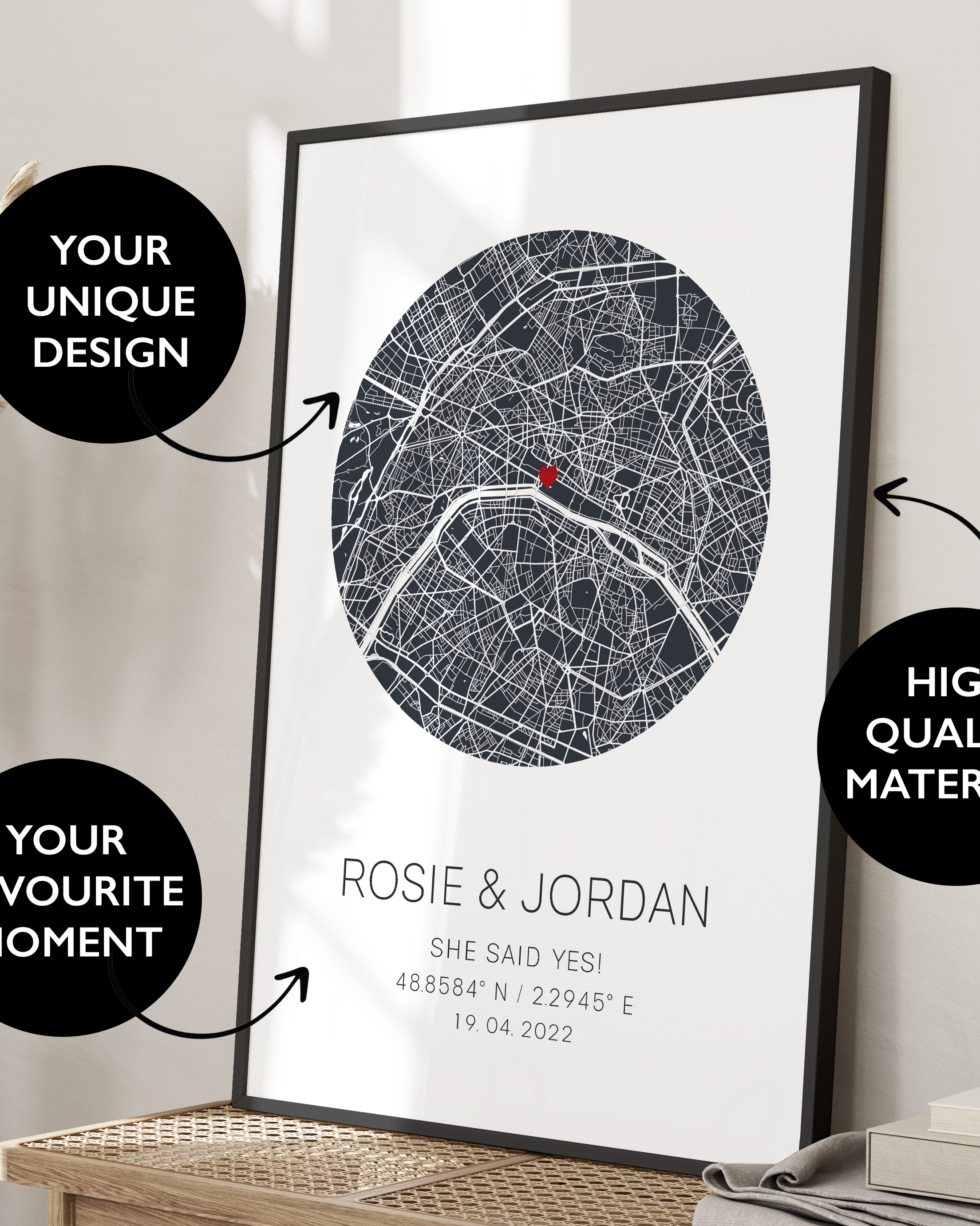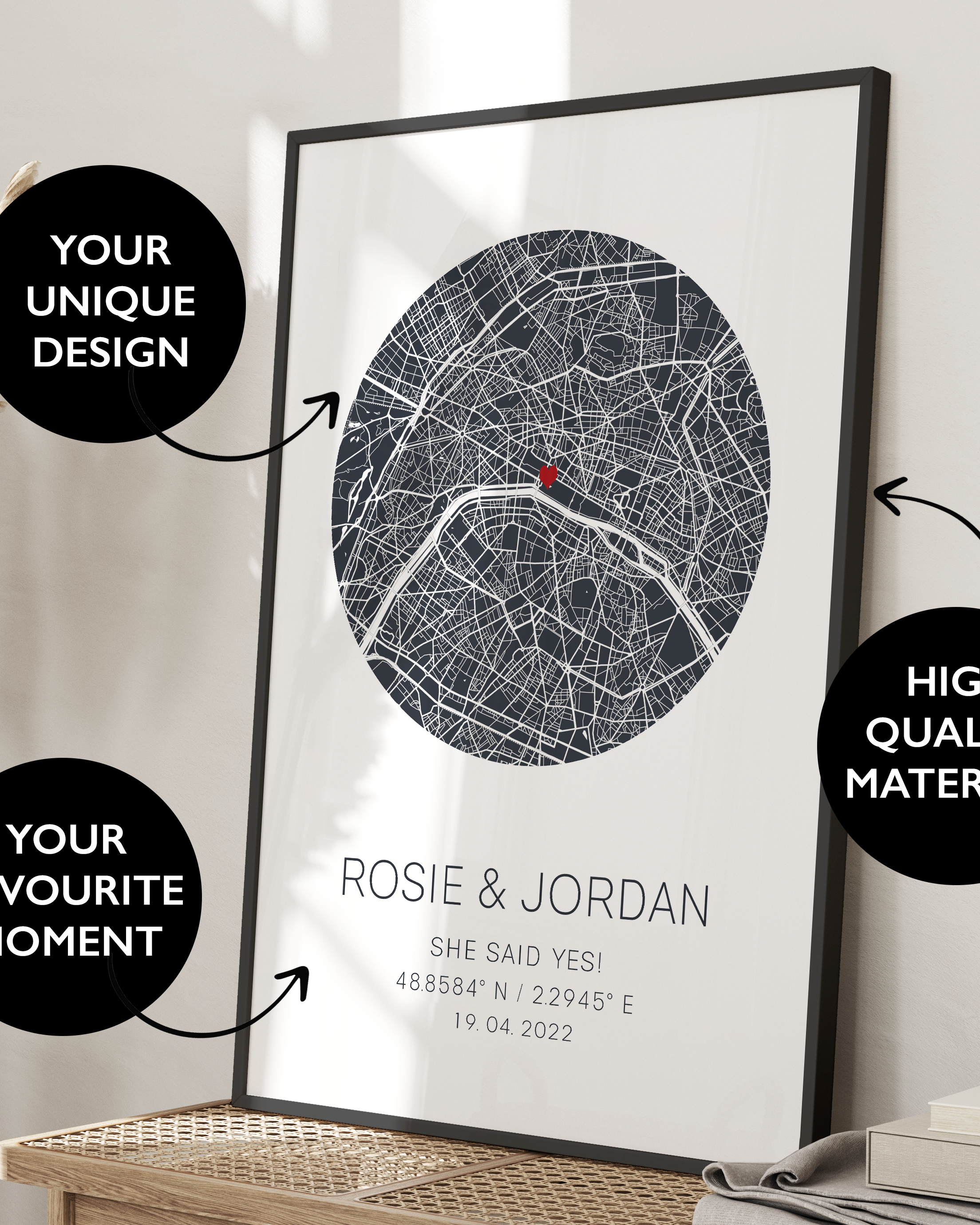 Fully Personalized – Add your names, engagement date, and the coordinates or location of your special moment.
