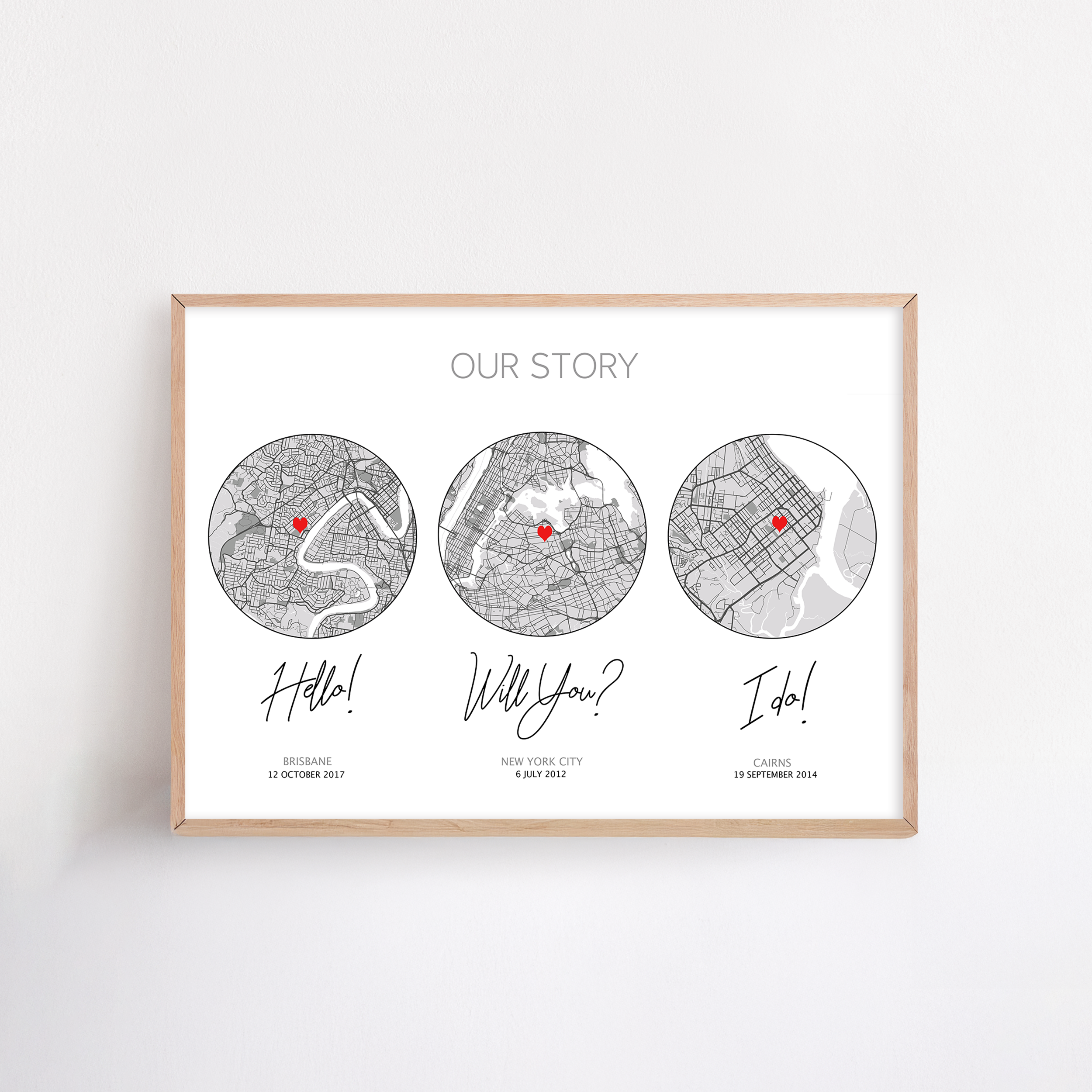 A custom our story map print is the perfect wedding gift for couples, anniversary gift for husband or wife or paper anniversary gift. It’s also a great wedding morning gift for your partner to surprise your future husband or wife with. Customise the text to suit your favourite three occasions.