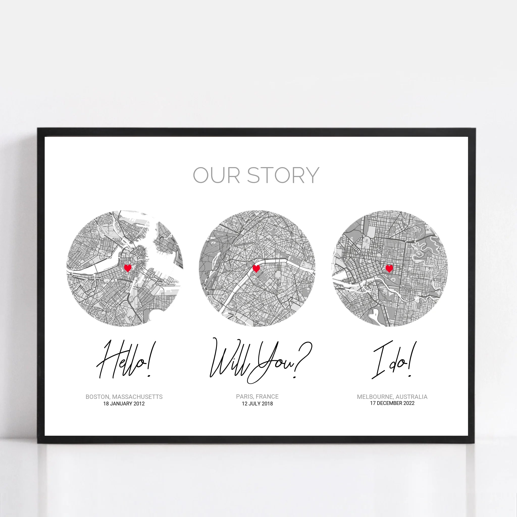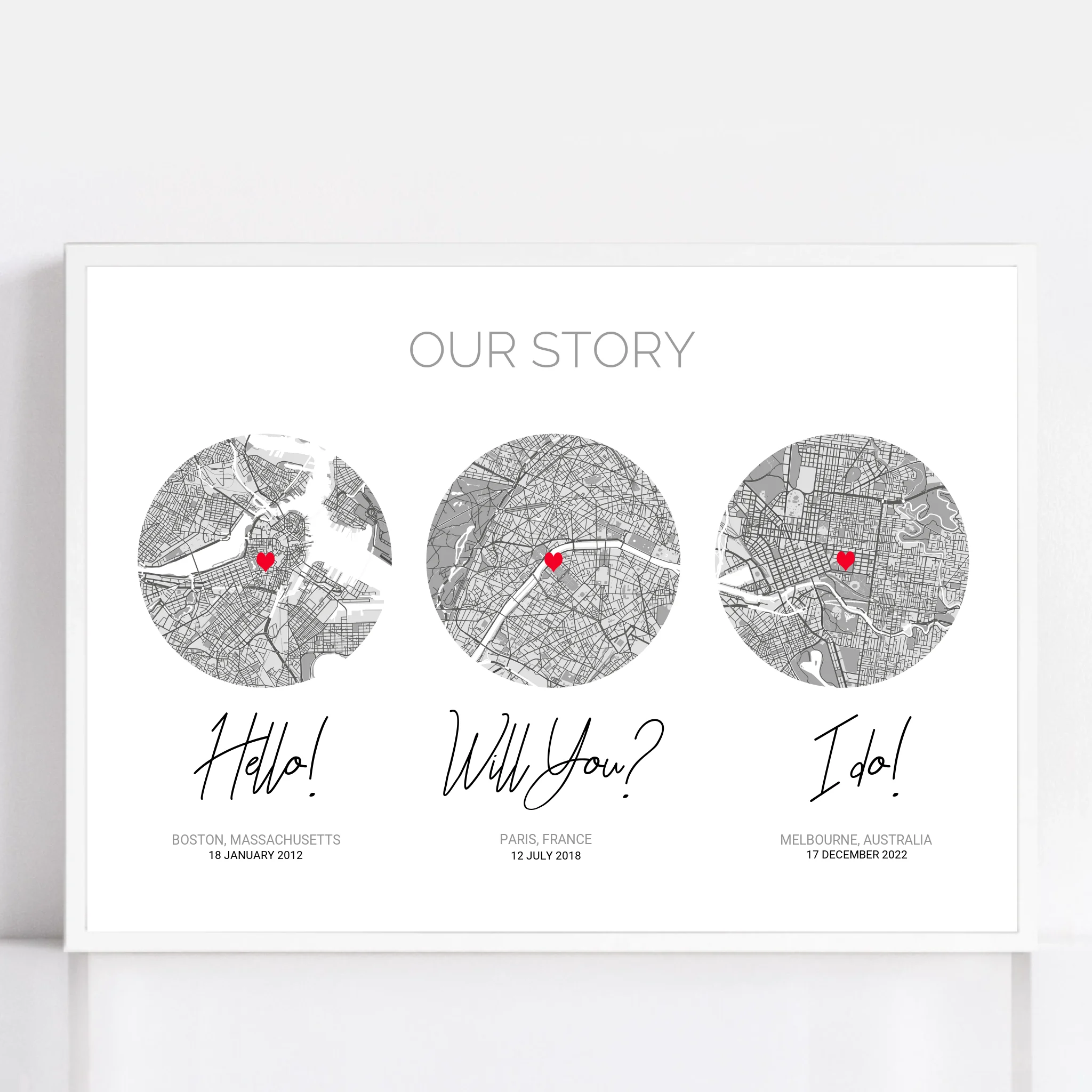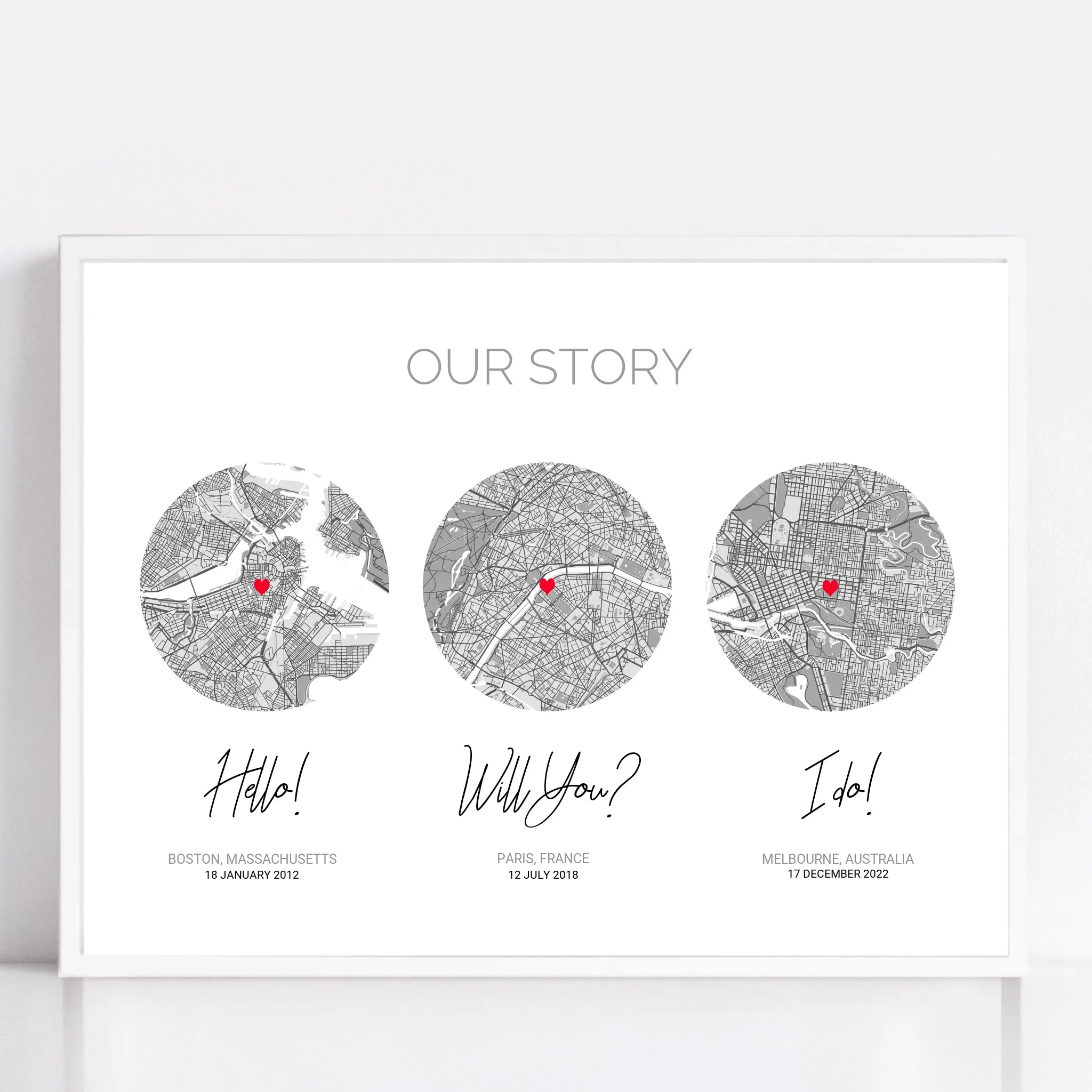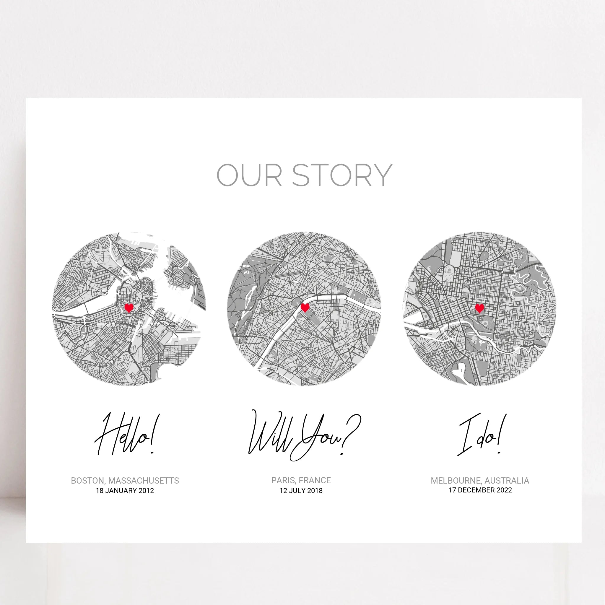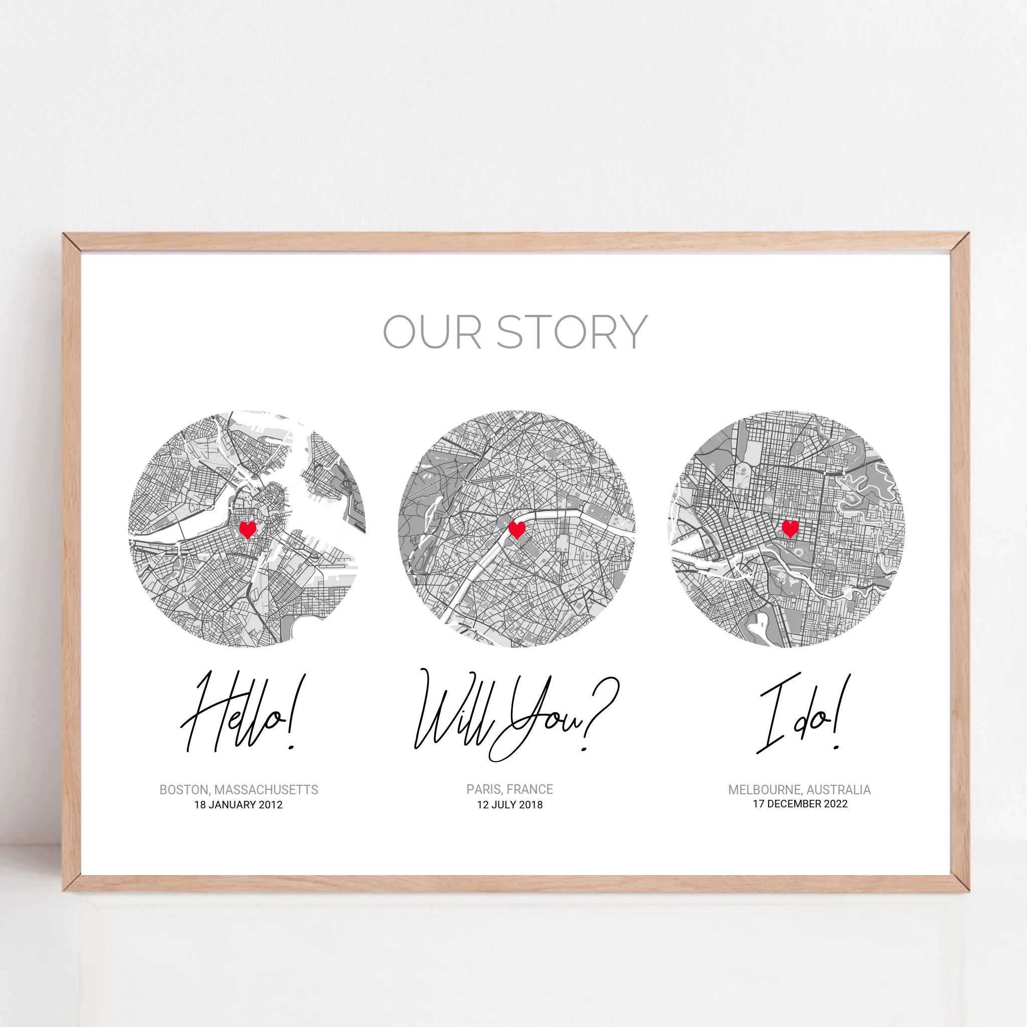 Tell your story with a personalised Our Story Print. The perfect paper anniversary gift, wedding gift or anniversary gift to celebrate the Hello, Will You and I do, or the, Met, Engaged, Married moments!